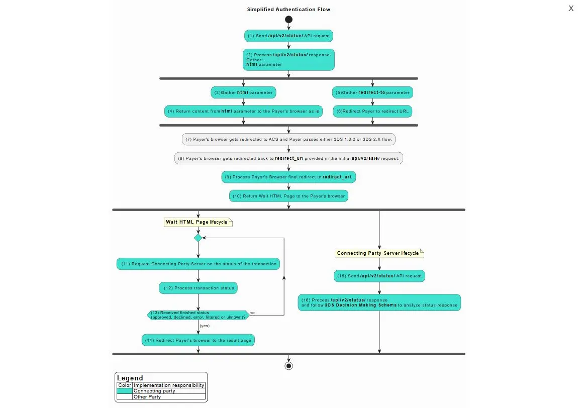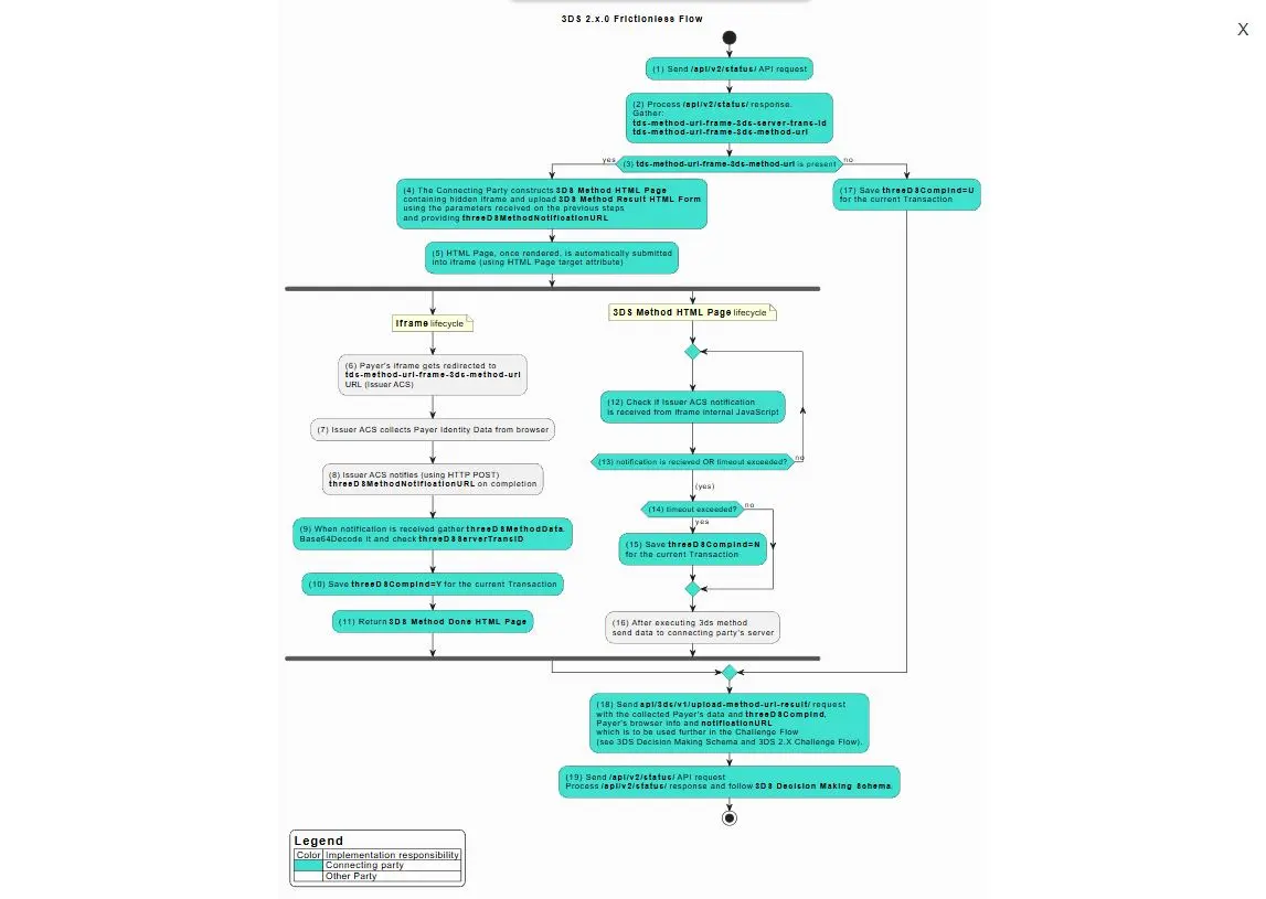 3DS Method HTML Page example below performs 3DS Method initiation through iframe technique and holding of the Sender’s browser until the 3DS Method is not finished on the Connecting Party server. Once it is finished or timeout is reached Connecting Party has to follow the next steps following 3DS Decision Making Schema and redirect Sender’s browser to the corresponding URL (either Challenge Flow or payment result page). Normal timeout value is 30 sec.
