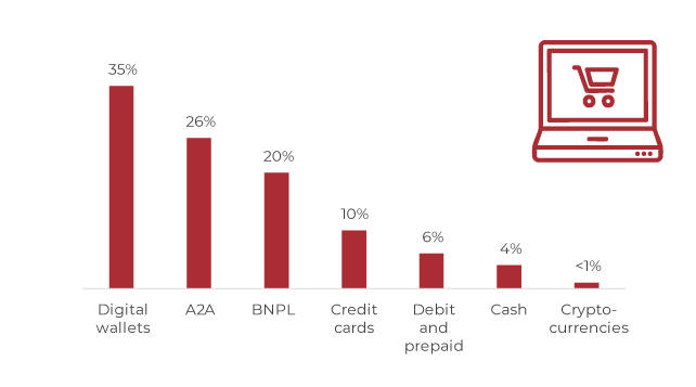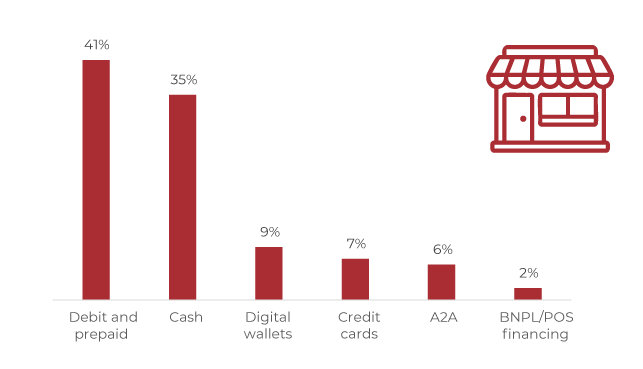 It should be noted that digital wallets are not yet widely used in retail trade. Here in Germany, debit and prepaid cards are in first place with a share of 41%, while 35% of transactions are carried out using cash. Digital wallets are in third place, accounting for 9% of transactions.